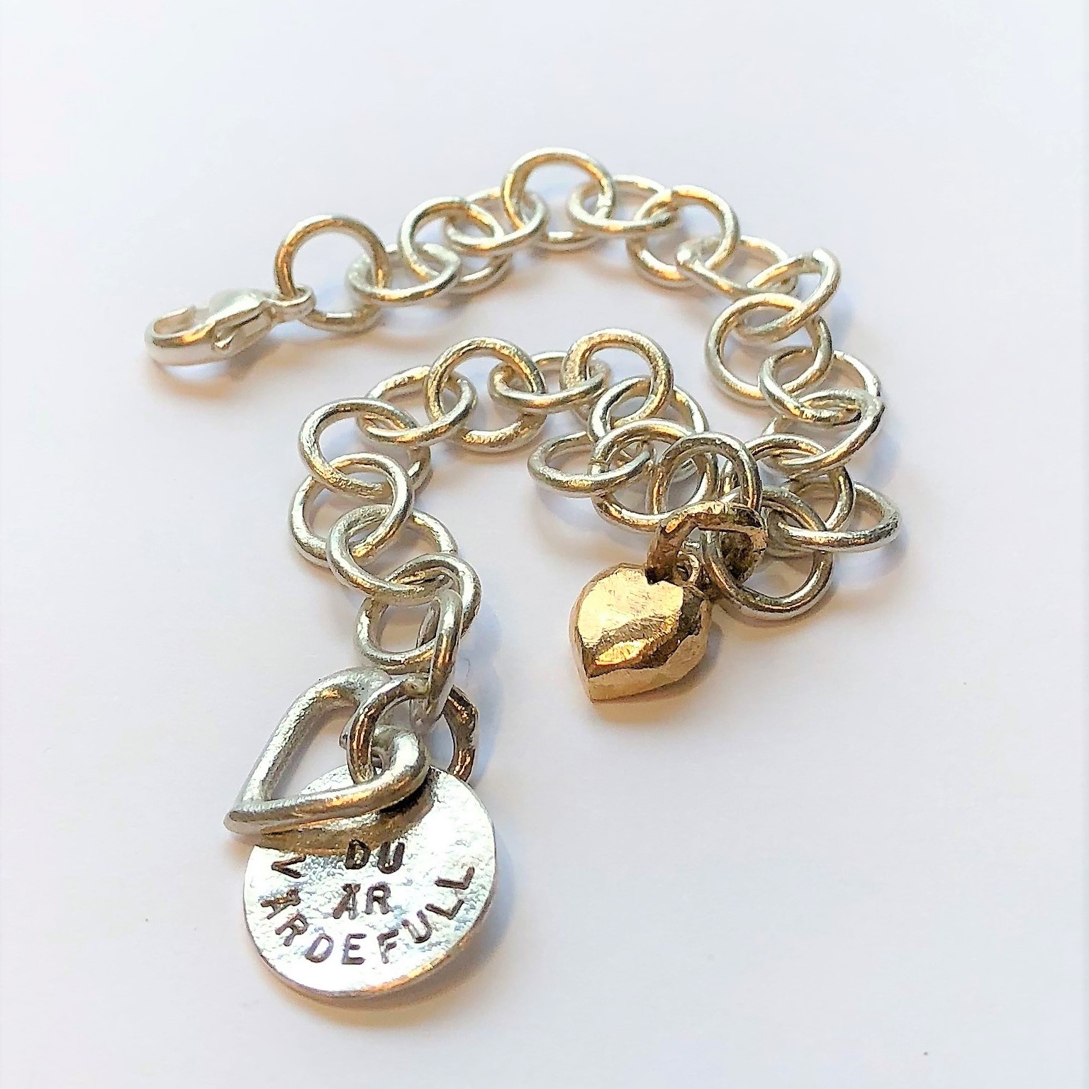 Hjärtat är gjort av en guldring från mormor och budskapsberlocken är från mor och far.